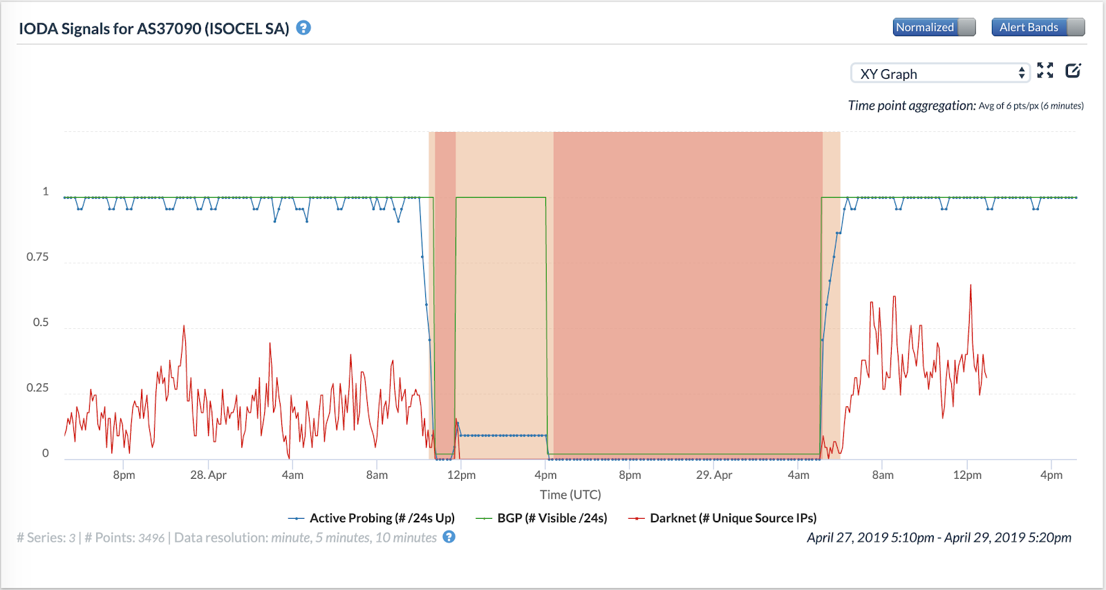 Figures 11 and 12 show that the blackout ended in AS28683 and AS37424 before midnight UTC on 29th April 2019, whereas the blackout ended in AS37090 at around 6 AM UTC. We also observe differences in how the blackout events manifest in IODA’s data sources. AS37090 and AS37424 see a significant drop in BGP-visible /24 blocks at the beginning of the outage. However, AS37090’s visible /24 blocks curve briefly reattains prior values before dropping again. AS28683, on the other hand, experiences only a drop in its active-probing curve initially.