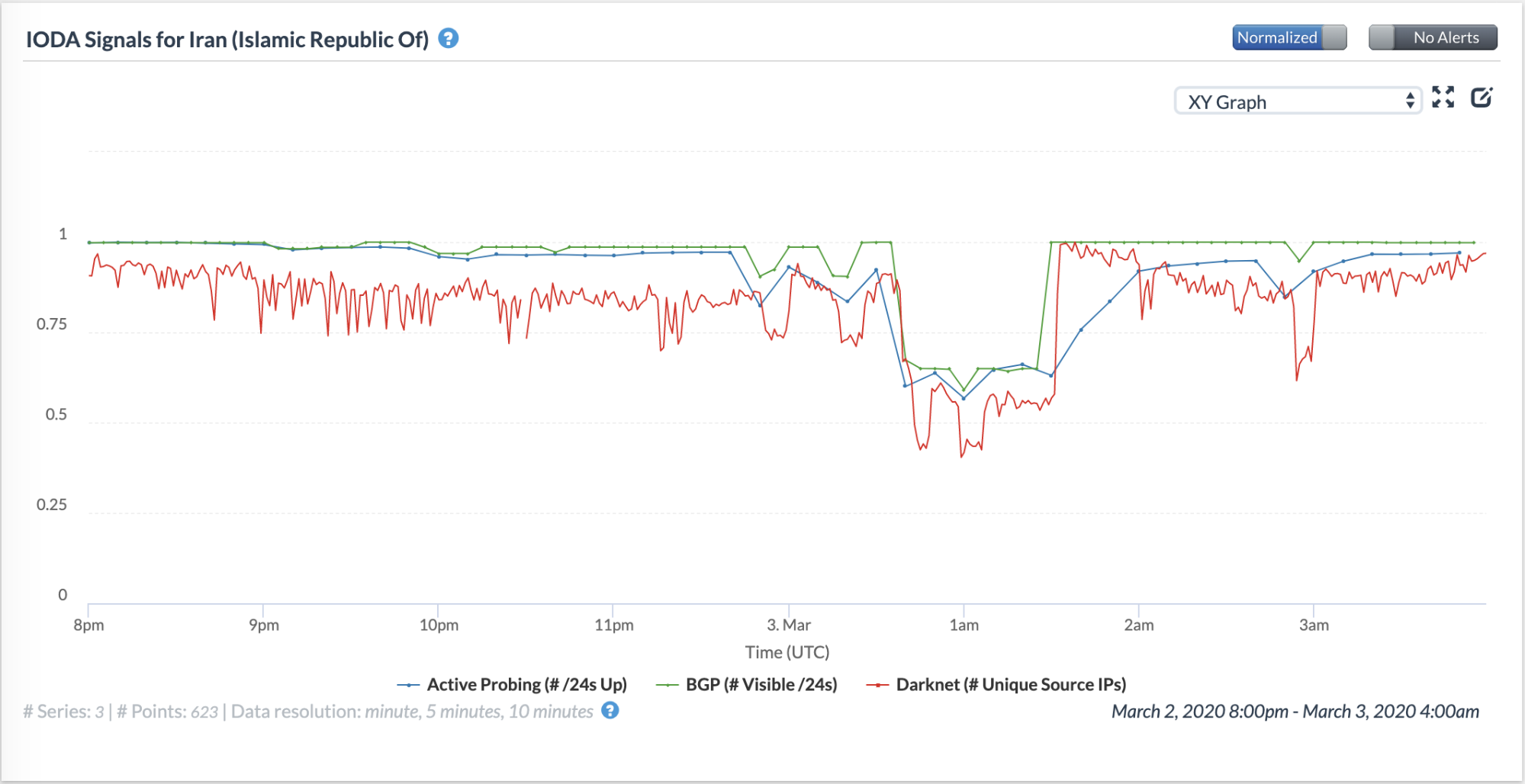 IODA data shows that all 3 of its signals experienced a significant drop in Iran between around 00:50 UTC and 01:30 UTC on 3rd March 2020, as illustrated below.