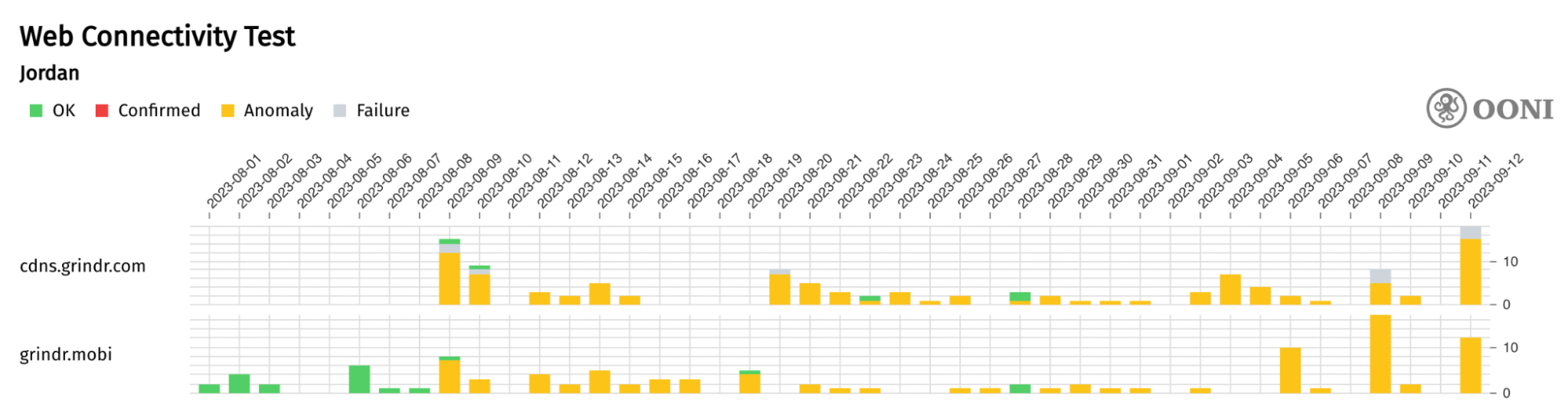 OONI network measurement data collected from Jordan suggests that ISPs started blocking access to Grindr on August 8th 2023, and that the block remains ongoing.