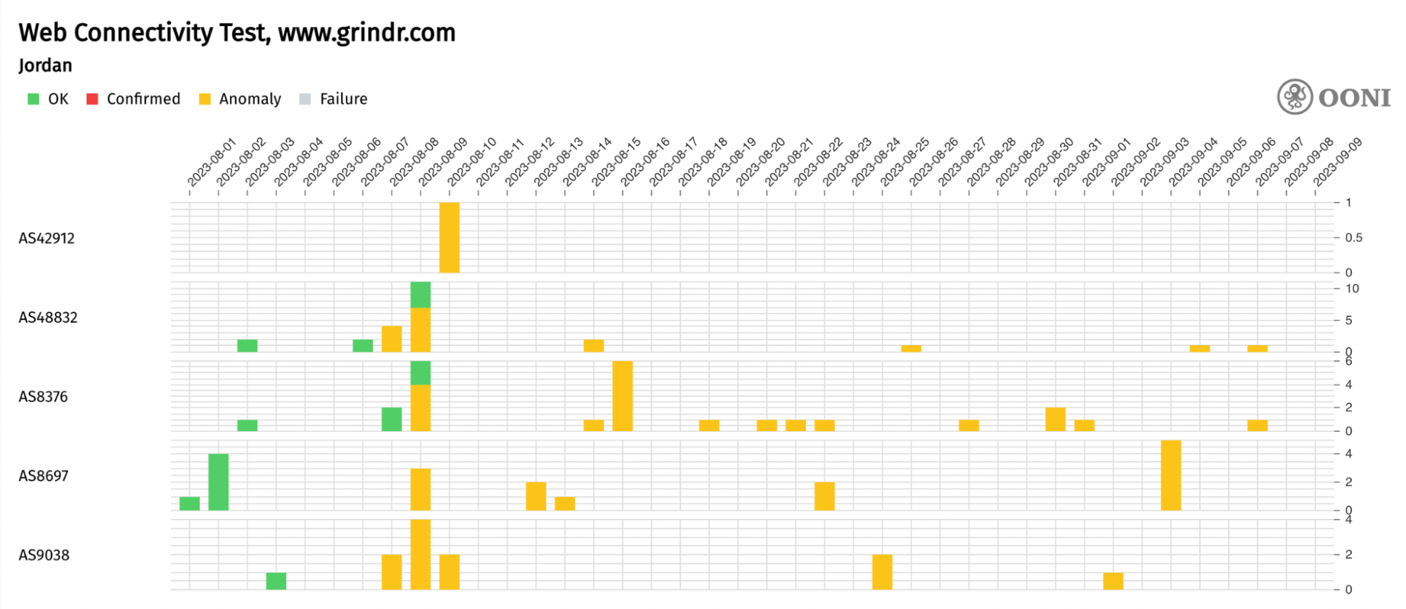 A per-network breakdown of the measurement coverage shows that the testing of www.grindr.com presented signs of blocking (“anomalies”) on all 5 tested networks in Jordan during the same period.