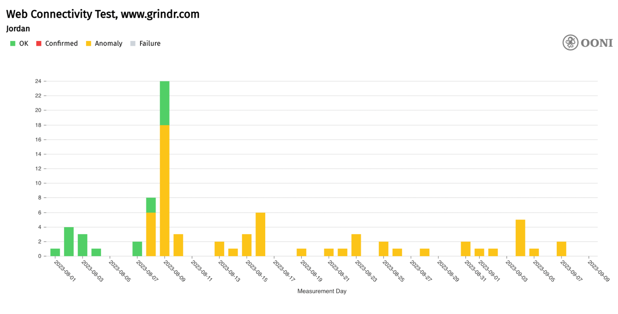 Chart: Blocking of Grindr domains (www.grindr.com and grindr.mobi) in Jordan in August 2023 (source: ooni/data tool).