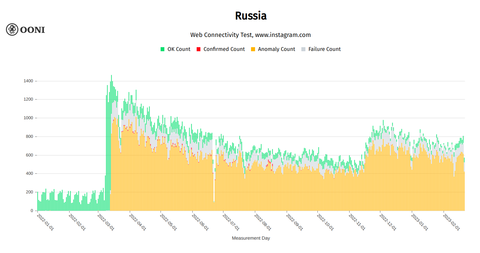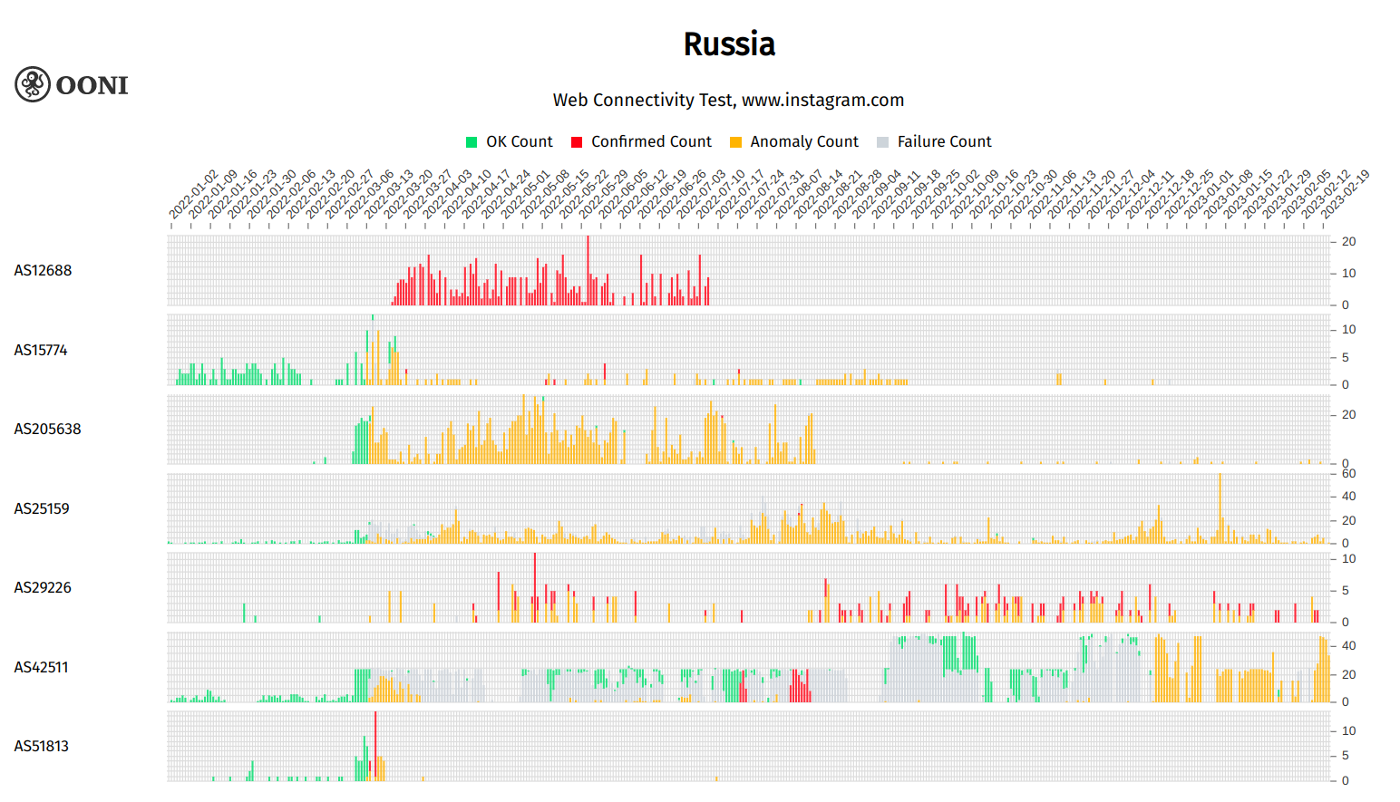 Chart: OONI Probe testing of Instagram (www.instagram.com) on 797 ASNs in Russia between 1st January 2022 to 21st February 2023 (source: OONI data).