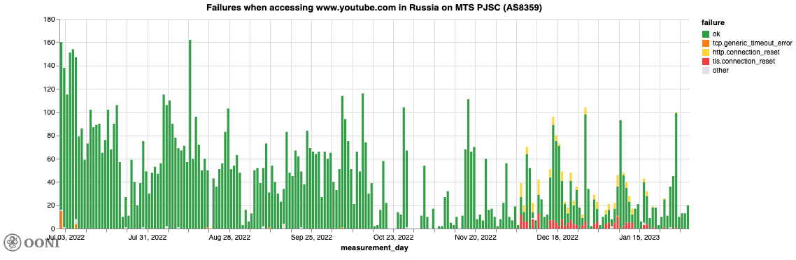 Chart: Failure types observed in OONI measurements pertaining to the testing of YouTube (www.youtube.com) on AS8359 in Russia between 1st July 2022 to 1st February 2023 (source: OONI data).