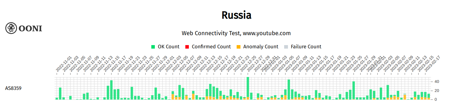 Chart: OONI Probe testing of YouTube (www.youtube.com) on AS8359 in Russia between 1st November 2022 to 19th February 2023 (source: OONI data).