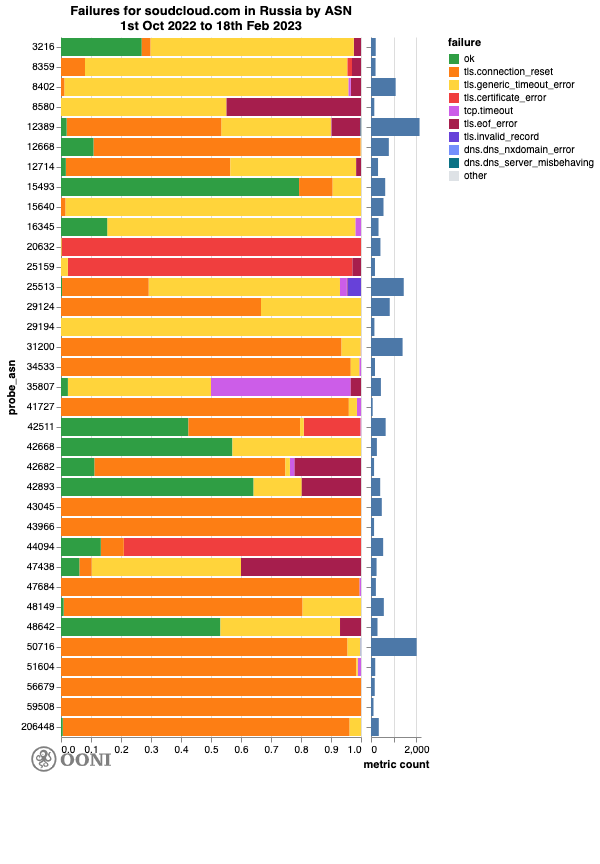 Chart: Measurement failures observed when soundcloud.com was tested on different ASNs in Russia (limited to ASNs that received at least 100 measurements) between 1st October 2022 to 18th February 2023 (source: OONI data).