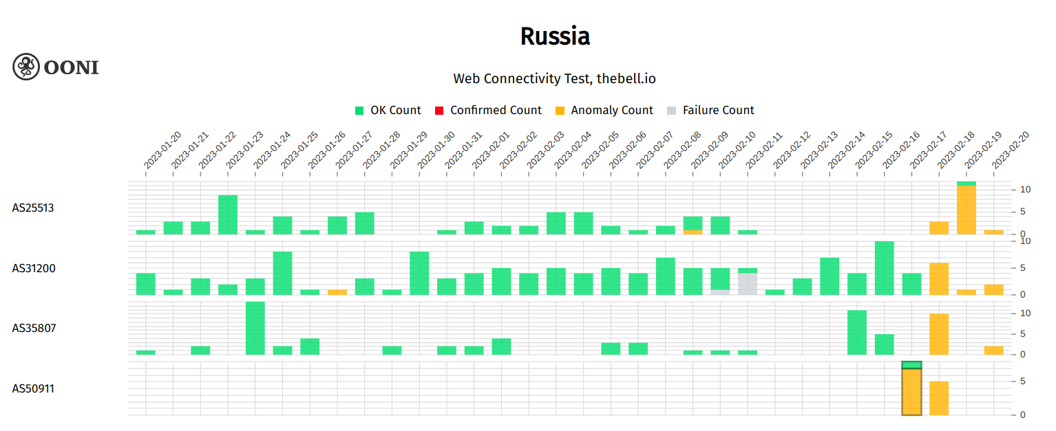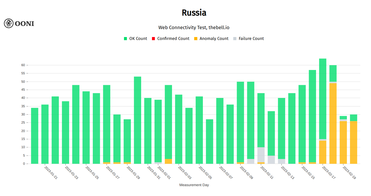 OONI data collected from Russia corroborates these reports, showing that Russian ISPs started blocking access to The Bell (thebell.io) on 17th February 2023.