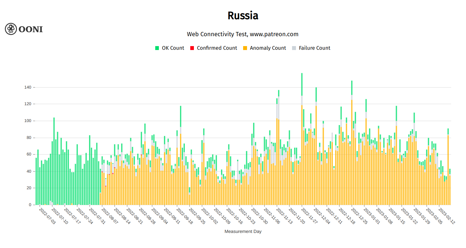 Starting from 6th August 2022, OONI data shows the blocking of Patreon in Russia.