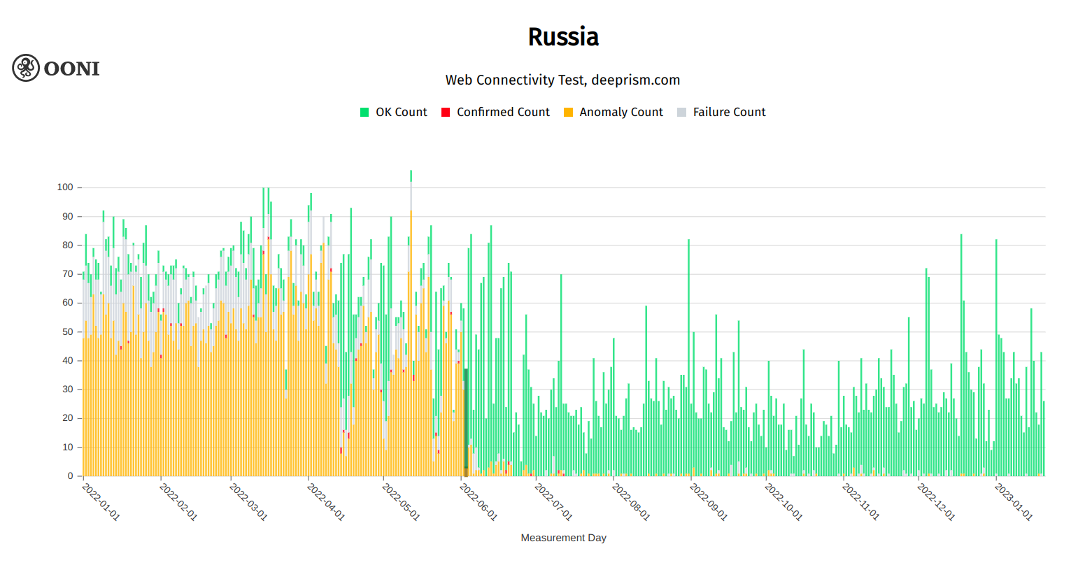 Starting from early June 2022, access to DEEPRISM’s website (deeprism.com) appears to have been unblocked in Russia, as suggested by OONI data.
