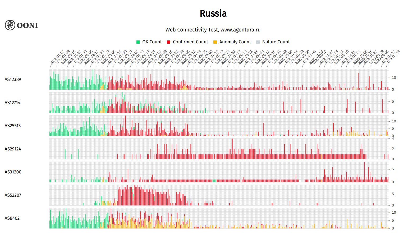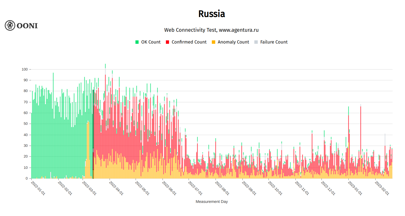 Chart: OONI Probe testing of www.agentura.ru on 380 ASNs in Russia between 1st January 2022 to 20th February 2023 (source: OONI data).