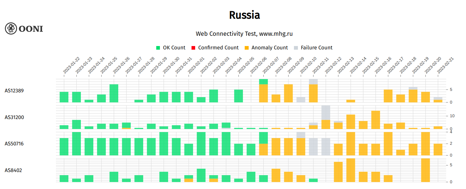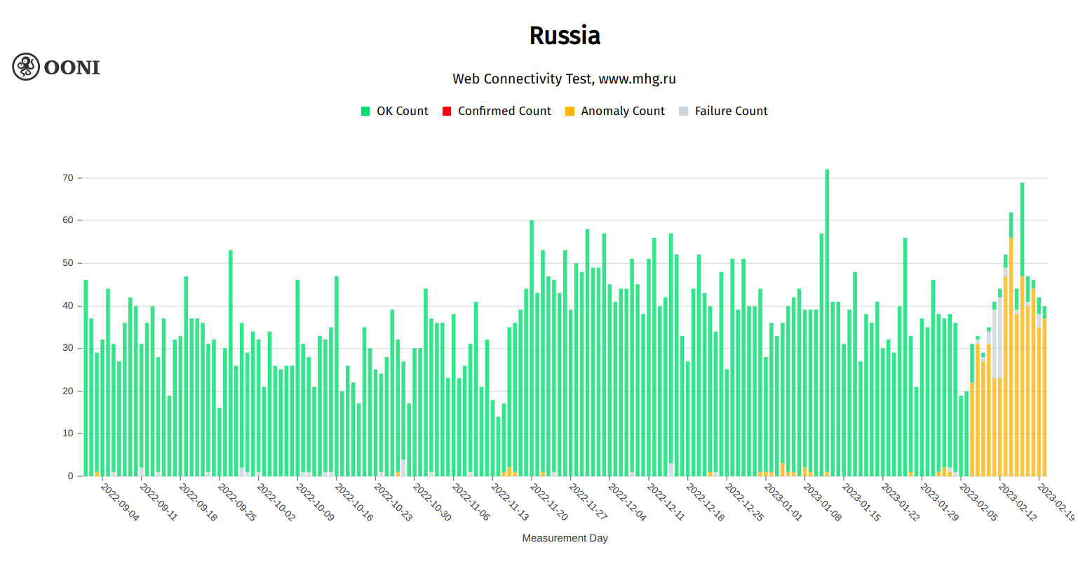OONI data collected from Russia corroborates the blocking of www.mhg.ru, starting from 6th February 2023.