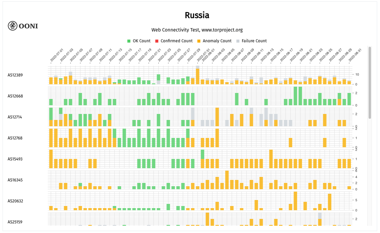 Chart: Per-ASN breakdown of OONI Probe testing coverage of www.torproject.org in Russia between 1st July 2022 to 1st September 2022 (source: OONI data).