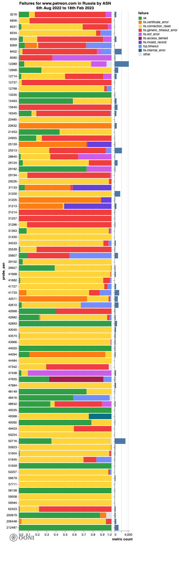 Chart: Measurement failures observed when www.patreon.com was tested on different ASNs in Russia between 6th August 2022 to 18th February 2023 (source: OONI data).