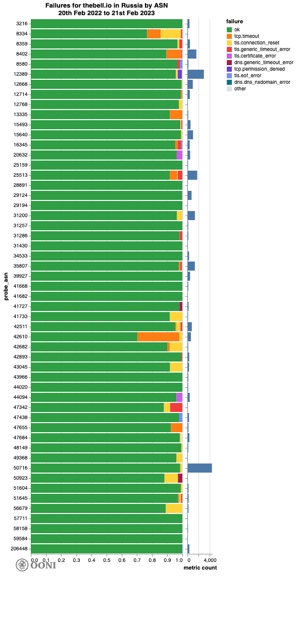 The following chart provides a breakdown of the specific failures observed on tested ASNs, suggesting that different ISPs in Russia block access to thebell.io using different censorship techniques.