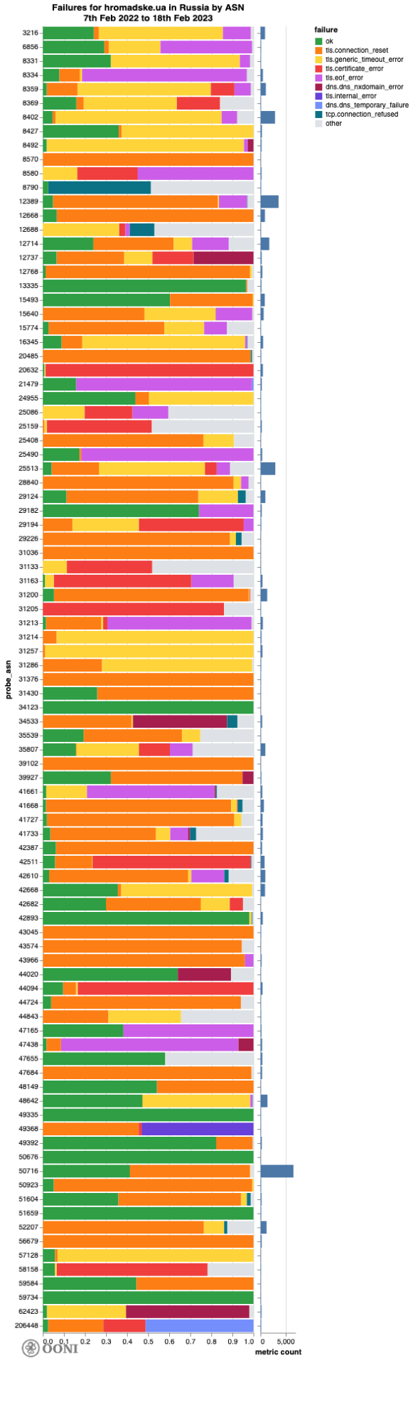 Chart: Measurement failures observed when hromadske.ua was tested on different ASNs in Russia between 7th February 2022 to 18th February 2023 (source: OONI data).