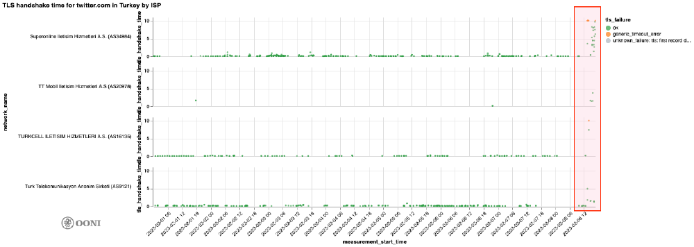 In the aftermath of the earthquake (on 8th February 2023), access to Twitter was reportedly temporarily restricted. OONI data collected from Turkey provides evidence that the block was implemented through targeted throttling and DNS interference.