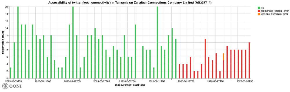 OONI data suggests that access to the social media platform X has been blocked in Tanzania since 20th May 2025.