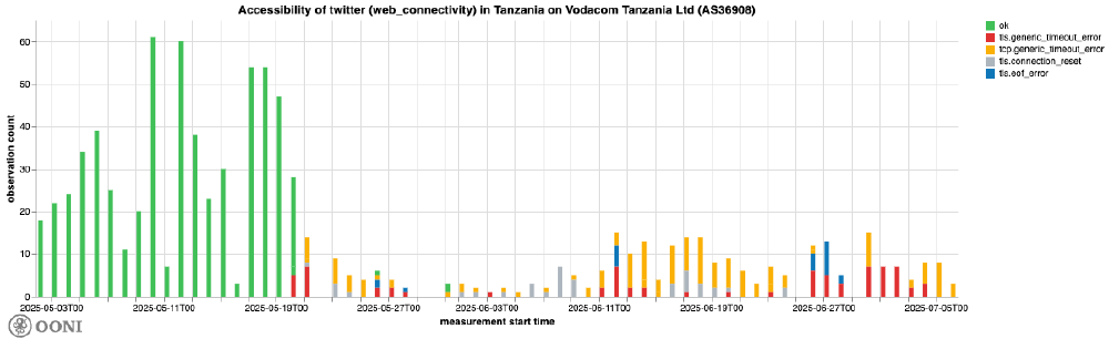 Chart: OONI Probe testing of twitter.com and x.com on Vodacom Tanzania Ltd (AS36908) between 1st May 2025 to 7th July 2025 (source: OONI data).
