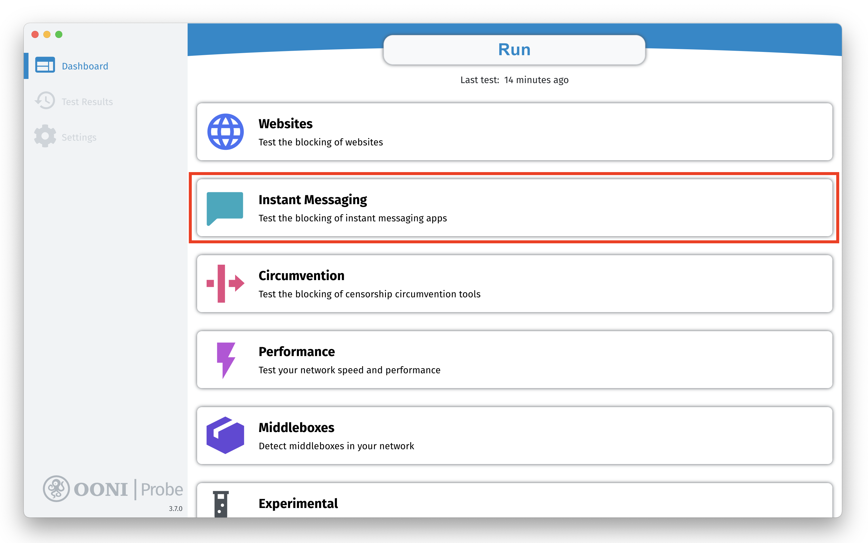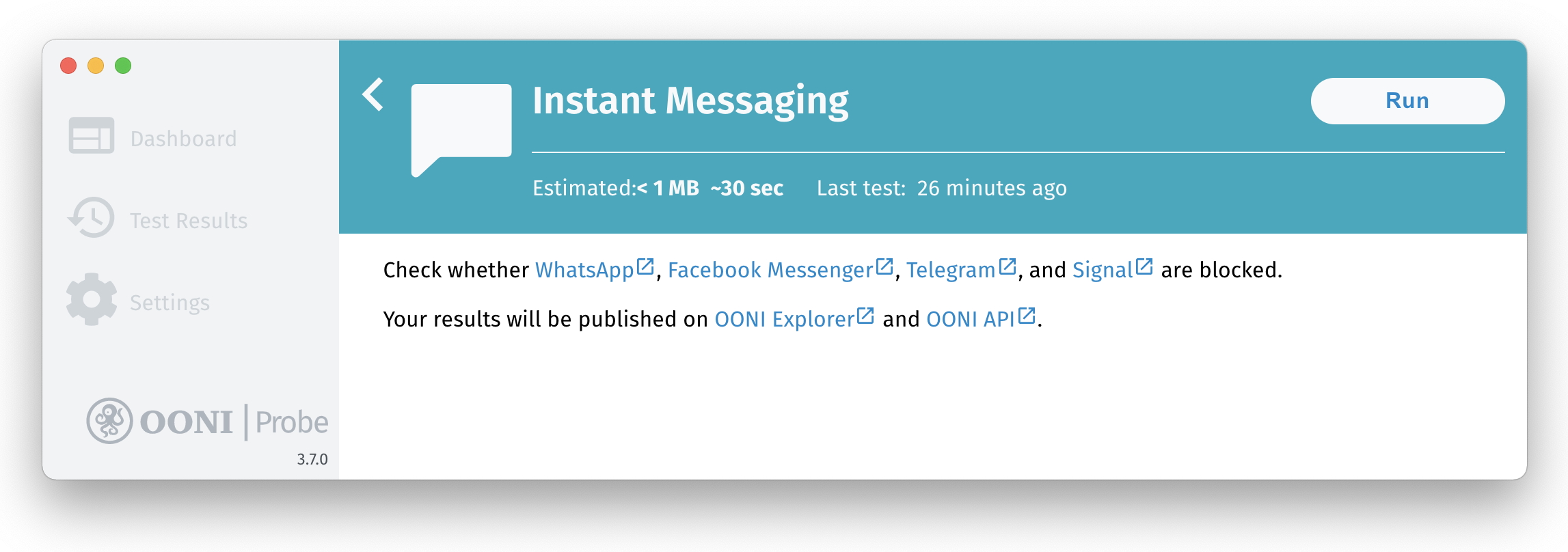 - Instant Messaging card. Includes OONI’s WhatsApp, Facebook Messenger, Telegram, and Signal tests which check if these apps are blocked.