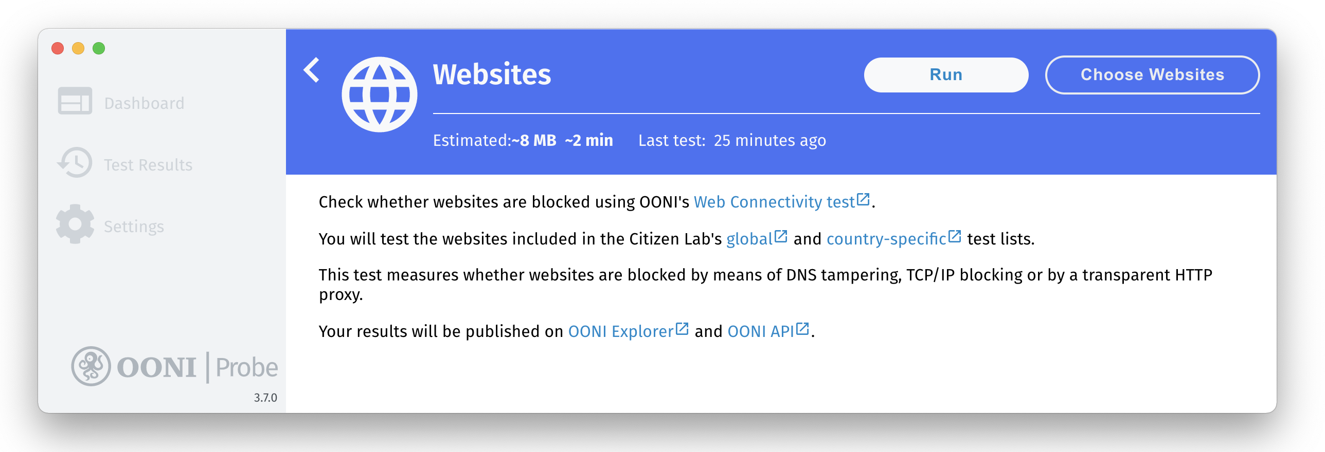 Your OONI Probe test results will automatically get published on OONI Explorer and on the OONI API.