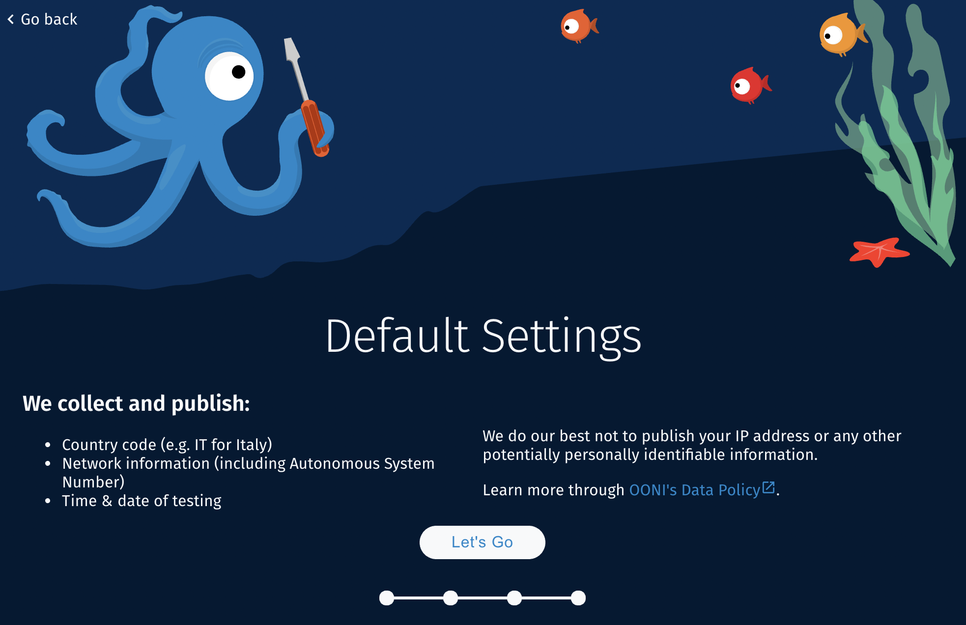 In the final step of the onboarding process, we share the types of data that are collected by default when running OONI Probe (linking to our Data Policy for further information). You can opt-in to sharing crash reports and app usage metrics to help us improve OONI Probe.