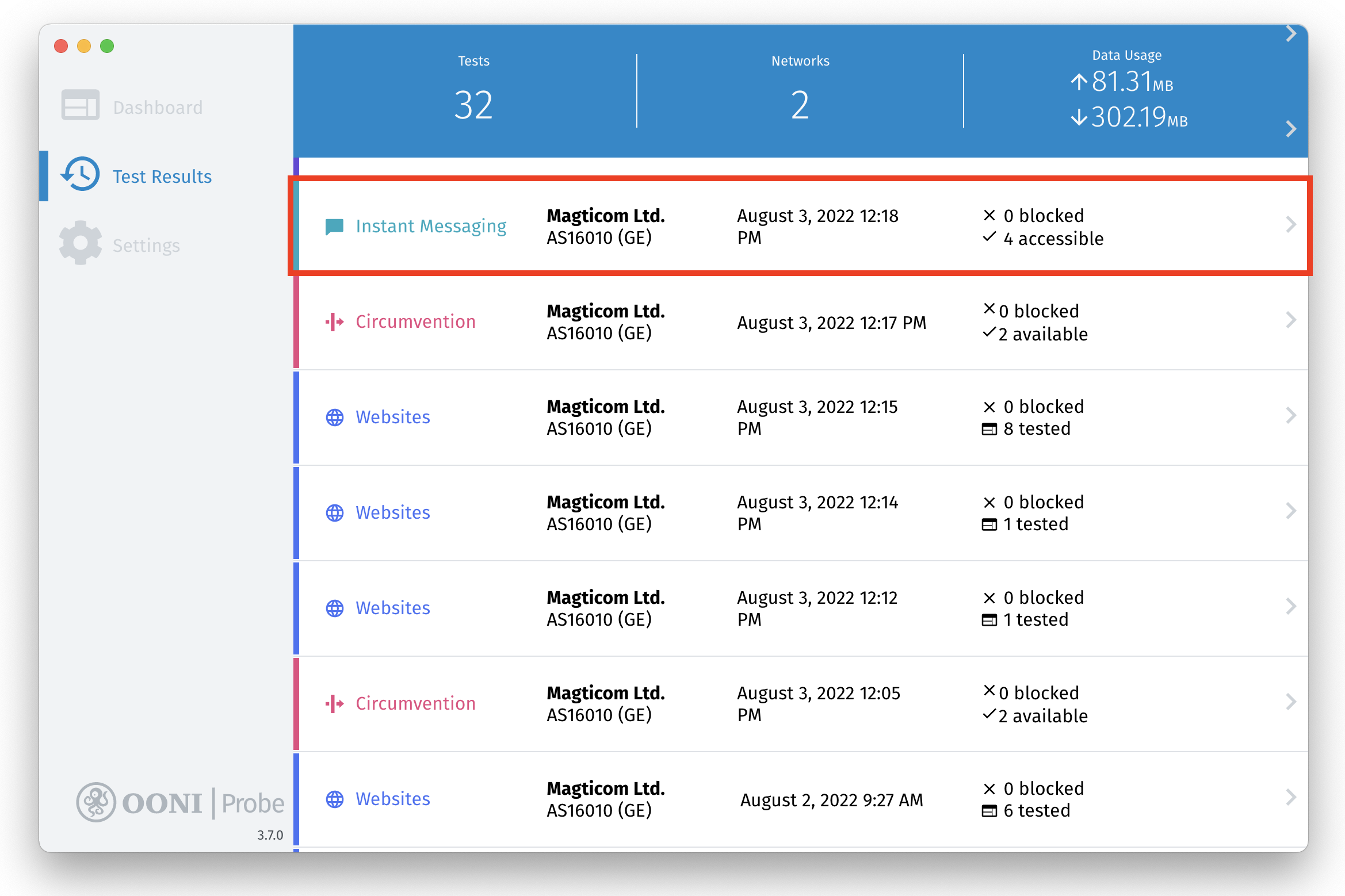 Similarly, you can access Telegram test results through the instant messaging results in your OONI Probe app.