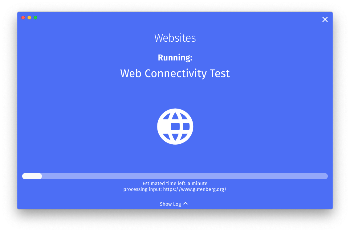 OONI Probe should have run all tests within a few minutes (though this depends on the performance of the network you’re connected to, and may take longer in some cases). If the performance of your network is not good enough and the tests take too long, you can stop the ongoing test by clicking the cross button in the top right corner.