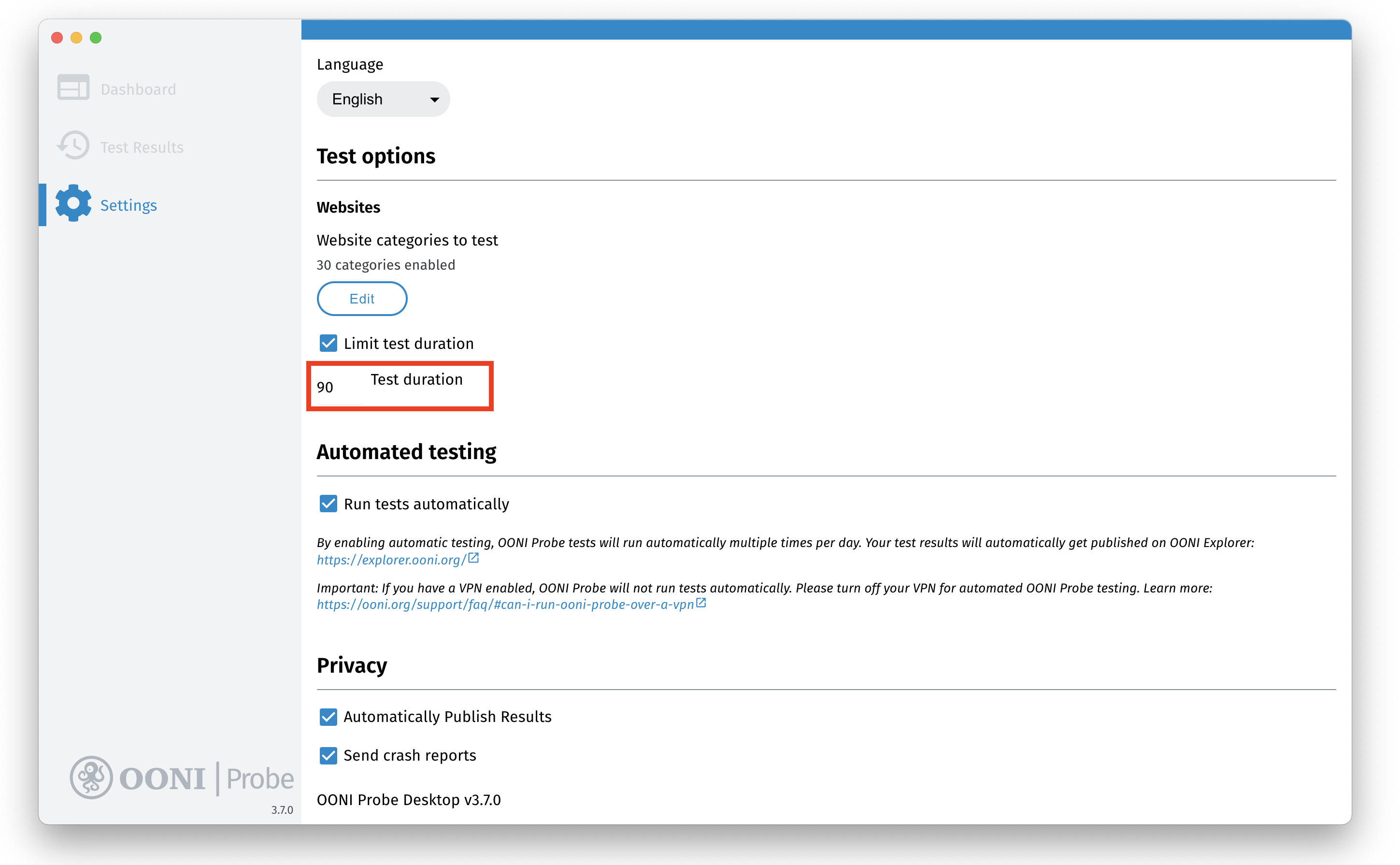 Detailed information about OONI Probe settings can be found in the Configuring your OONI Probe settings section of this guide.
