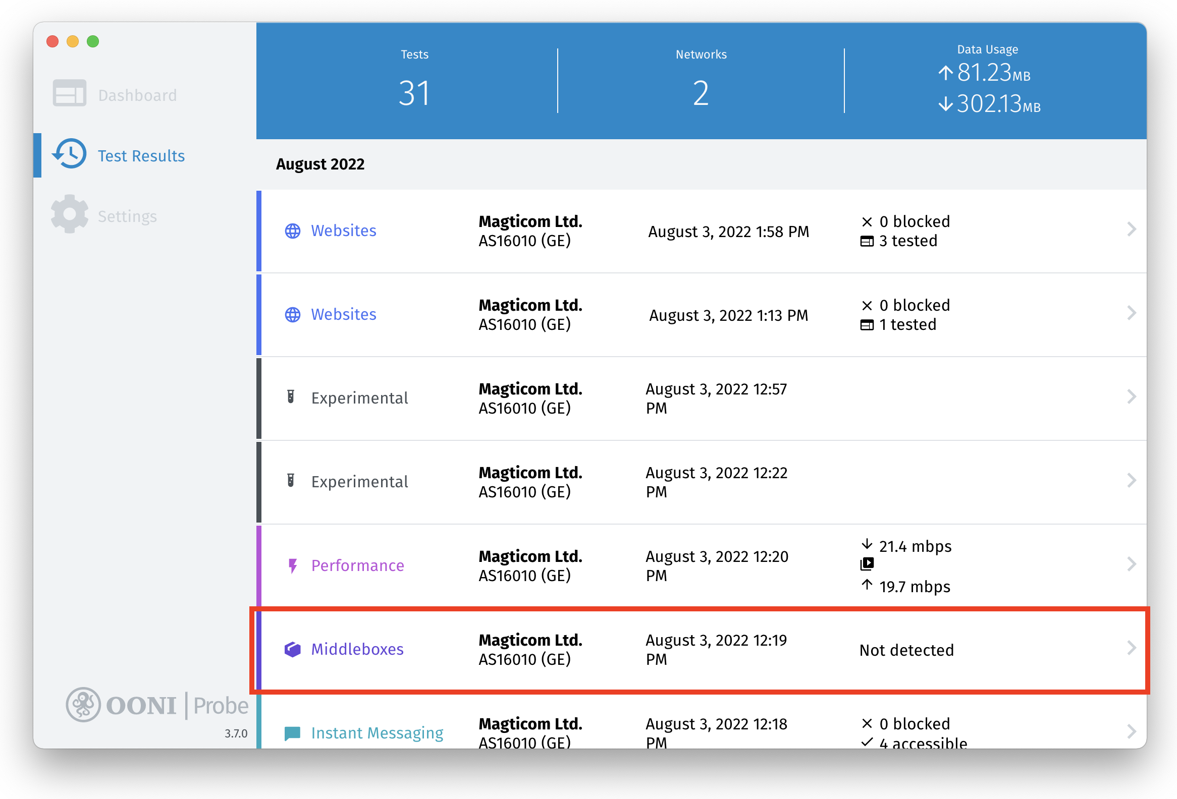 Similarly, you can access OONI’s HTTP Header Field Manipulation test results through the middlebox results in your OONI Probe app.