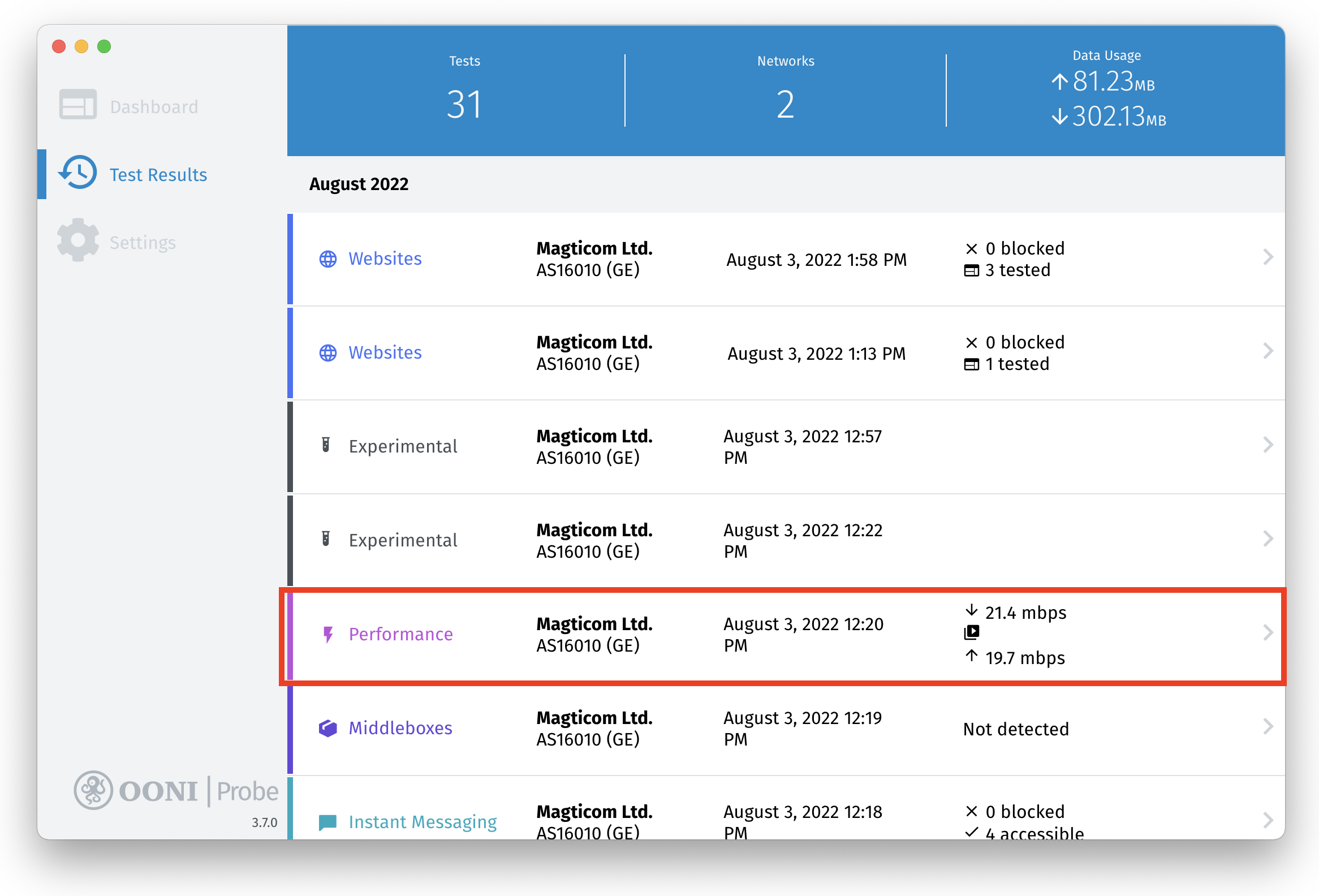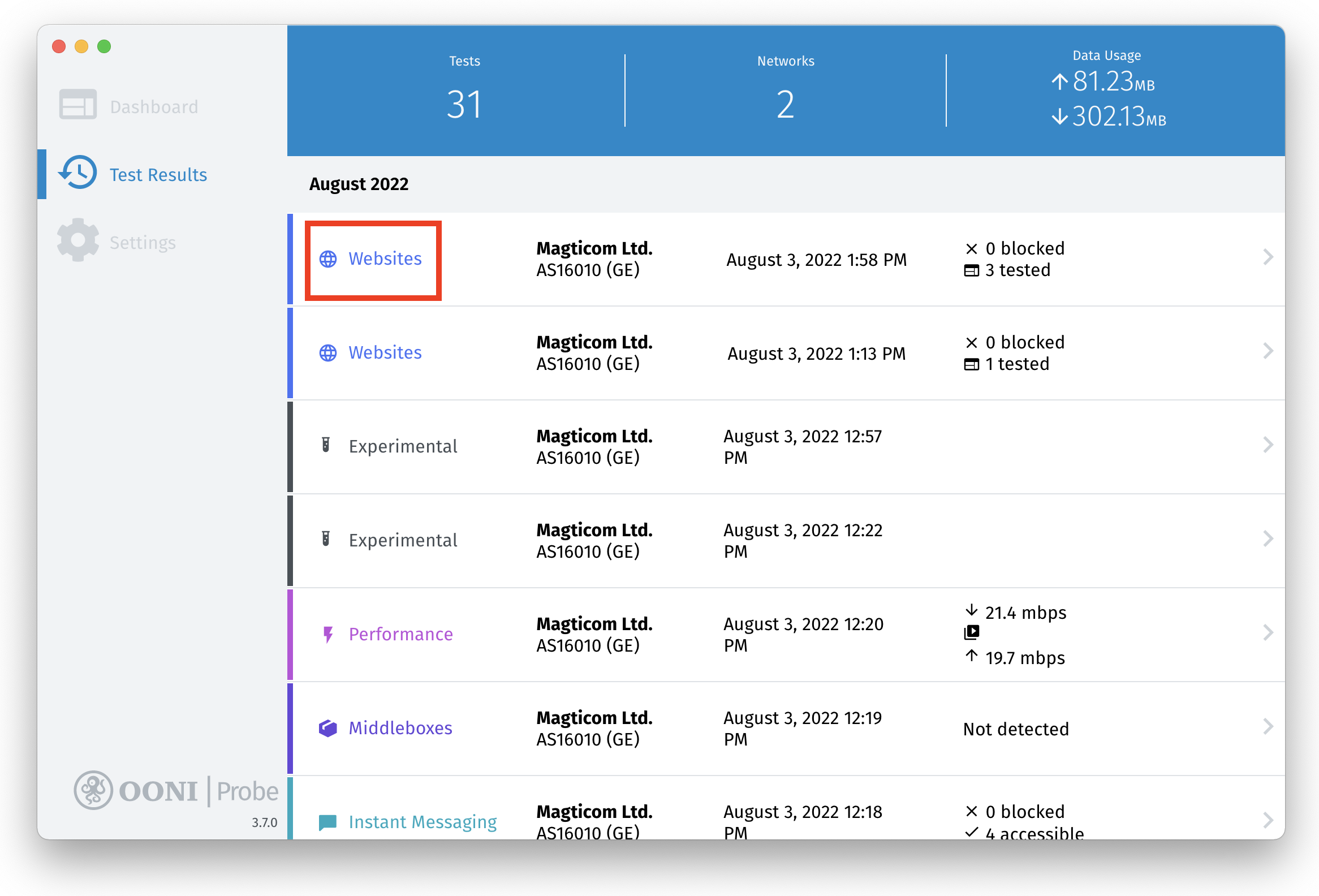 AS16010for Magticom Ltd.); - Network measurement data (which depends on the OONI Probe test).