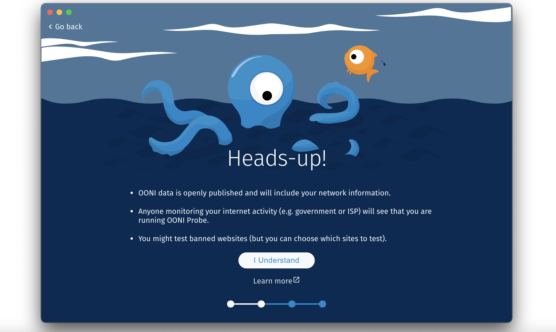 Step 3. Once you have learned about potential risks associated with running OONI Probe, click I understand.