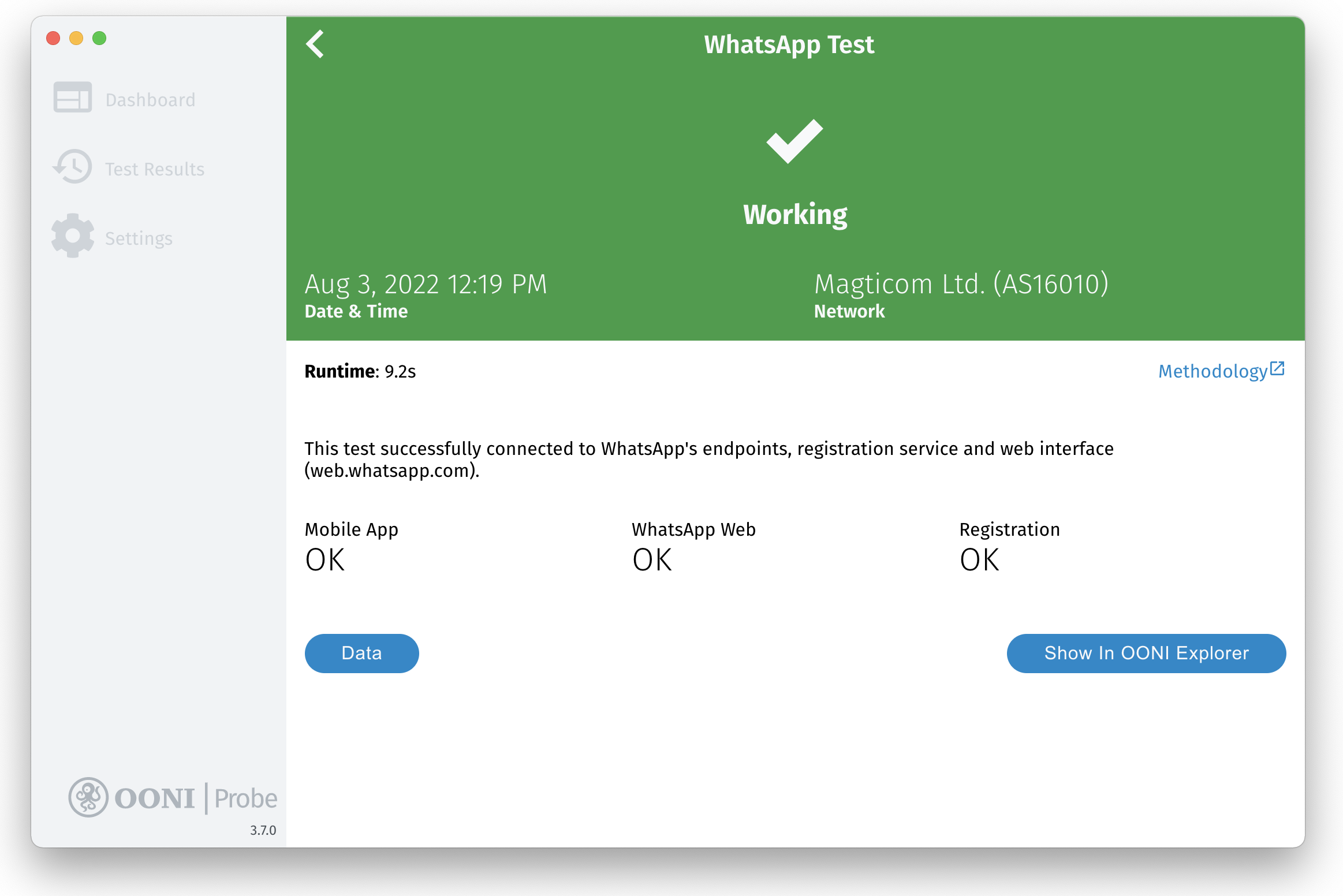 - Access the measurement on OONI Explorer (where it is automatically published) and potentially share it with your contacts.